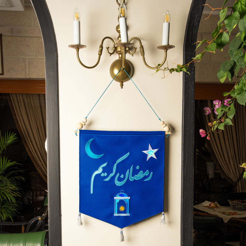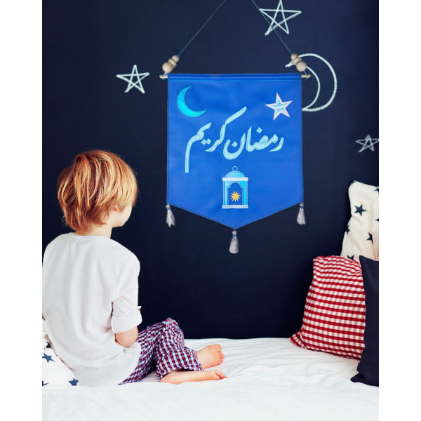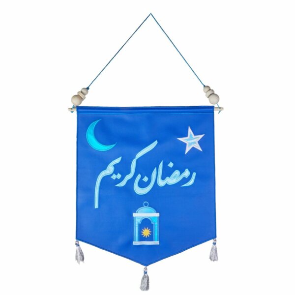 This elegant Ramadan banner is crafted from luxurious royal blue leather, with the words ‘رمضان كريم’ (Ramadan Kareem) in Arabic beautifully embossed across it. The design features a crescent moon and a lantern, both intricately depicted in varying shades of blue, adding depth and richness to the scene. A shining silver star sits beside the moon, while the lantern is illuminated by a warm yellow star inside. The banner is further embellished with delicate silver tassels, creating a refined and festive touch, perfect for celebrating the holy month of Ramadan.