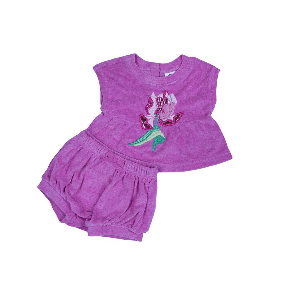 Soft pink towel Terry short and t-shirt set with a beautiful floral design in the middle.