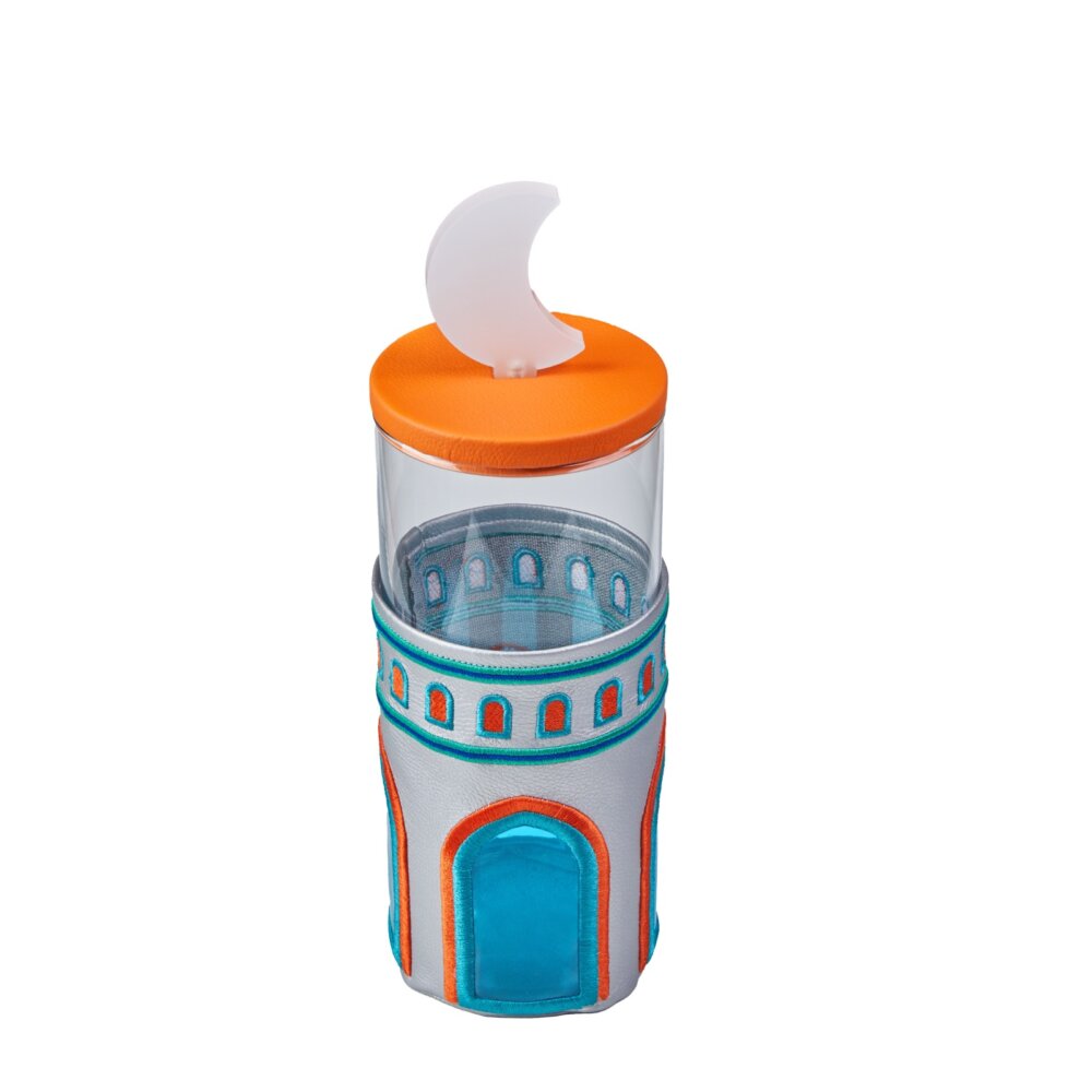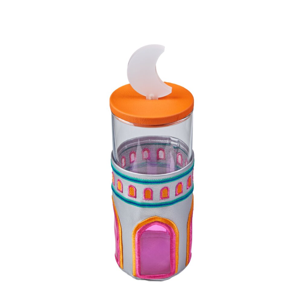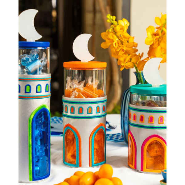 A beautifully crafted cylindrical glass box, designed to elegantly hold sweets and treats during the holy month of Ramadan. The box features transparent windows on all sides, allowing a clear view of the delicacies inside. The windows are delicately embroidered with intricate patterns, adding a touch of traditional craftsmanship and elegance. The box is encased in a sleek, high-quality leather cover, giving it a refined, luxurious look. A crescent-shaped handle, symbolizing the moon, is attached at the top, making it easy to carry while adding a festive touch. This exquisite piece serves as both a functional storage solution and a decorative item for your Ramadan gatherings, elevating the experience with its charm and timeless design.