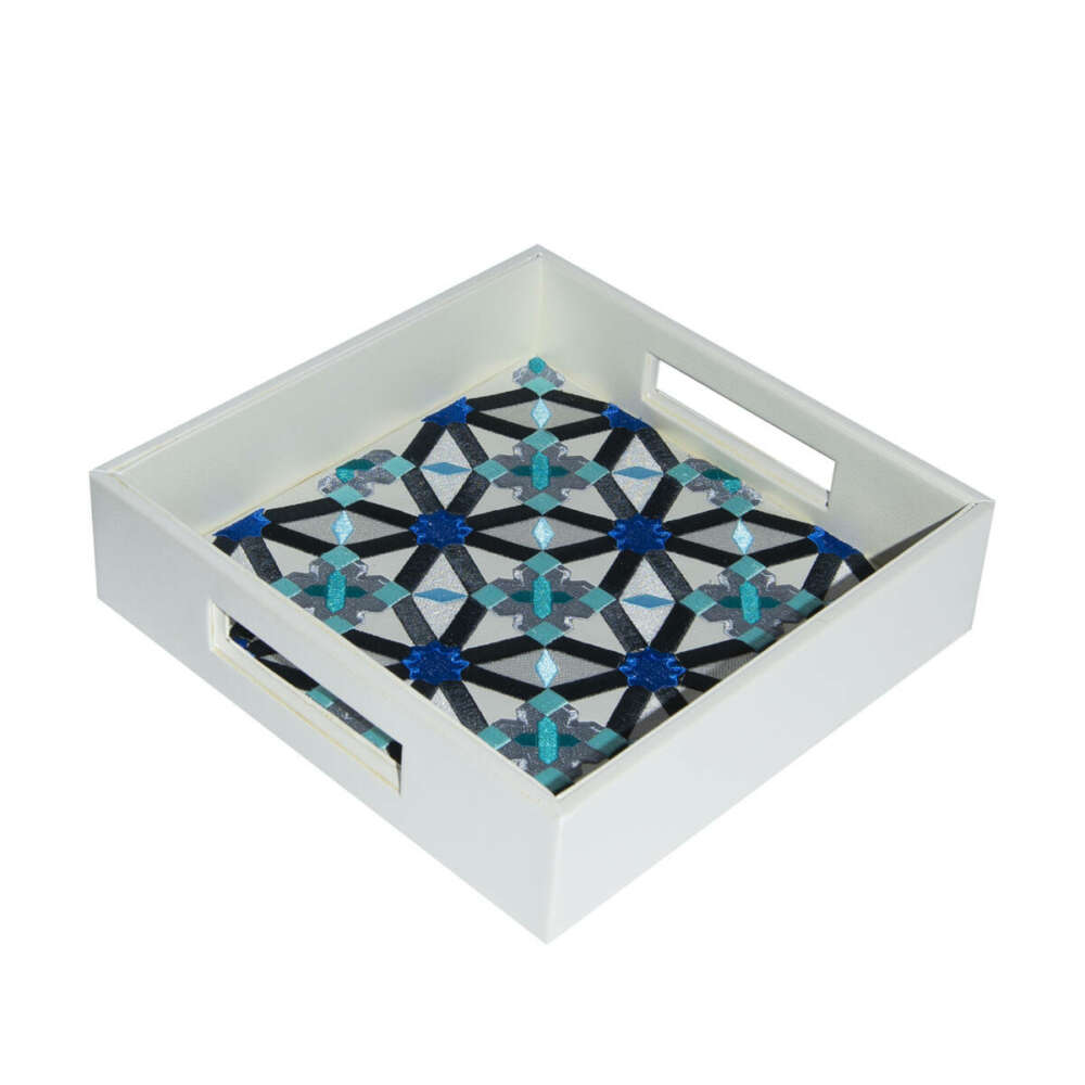 Oriental pattern leather tray for your tea and coffee mugs, comes with an acrylic insert.