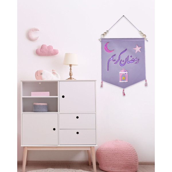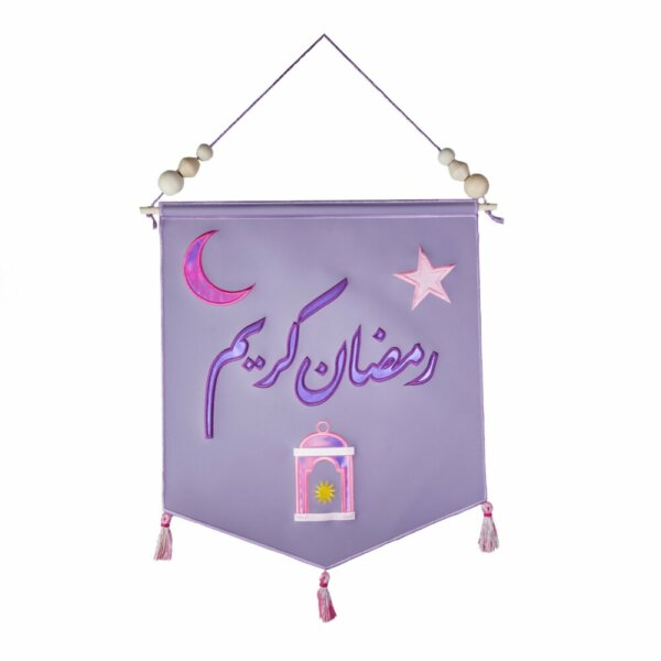 This elegant Ramadan banner is crafted from luxurious purple leather, with the words ‘رمضان كريم’ (Ramadan Kareem) in Arabic beautifully embossed across it. The design features a crescent moon and a lantern, both intricately depicted in varying shades of pink adding depth and richness to the scene. A shining pink star sits beside the moon, while the lantern is illuminated by a warm yellow star inside. The banner is further embellished with delicate pink tassels, creating a refined and festive touch, perfect for celebrating the holy month of Ramadan.