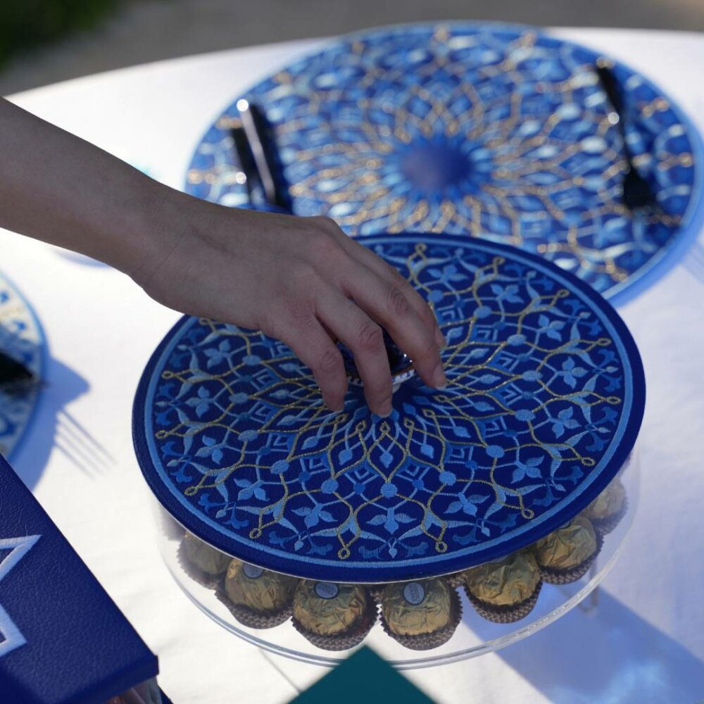 Round Arabesque pattern on leather box with a handle. perfect for storing your sweets and treats. Available in two different color combinations.