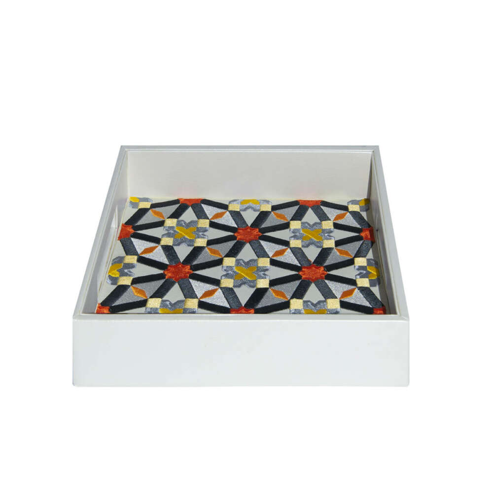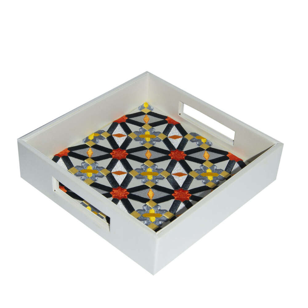 Oriental pattern leather tray for your tea and coffee mugs, comes with an acrylic insert.